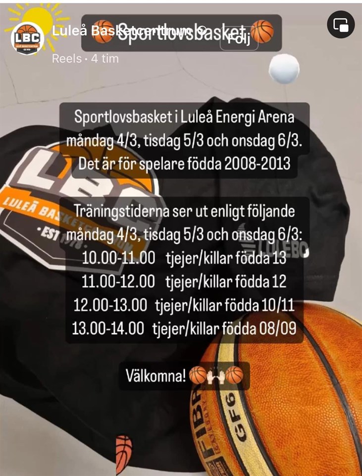 Under sportlovet kör vi inga ordinarie träningar utan vi kör Sportlovsbasket på Luleå energi arena måndag, tisdag och onsdag kl 10-11. Dom är inlagda i kalendern, vi skickar inte nån kallelse till dessa träningar. P-12 / 13 21 feb 2024 0kommentarer