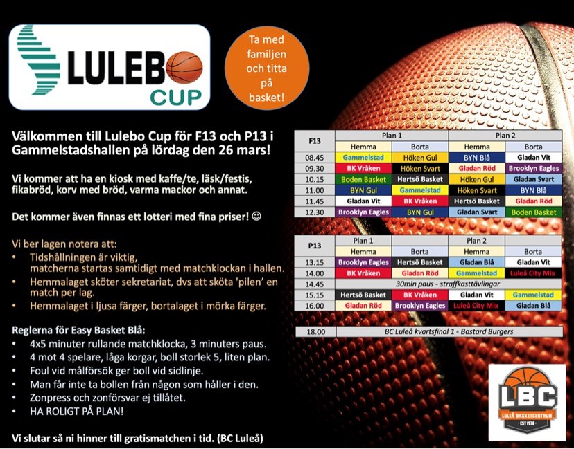 Nu på fredag är det hemmamatch för BC Luleå och i samband med detta är Hertsö Basket Pojkar 09 med i 4-sign stafetten som sker i samband med matchenkom och hejda tillsammans med din familj. Är ni intresserade av biljetter möts vi upp i foajén på Luleå Energi Arena kl. 18.30 på fredag och ni får då biljetterna på plats. Vi sitter alla tillsammans på kortsidan. 🏀👏😀 P-12 / 13 3 mar 2022 0kommentarer