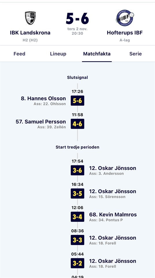 A-laget mötte Div2 laget Landskrona Falcons Torsdagen den 2:e November tog sig vårt A-lag till Landskrona för att spela en match mot division 2 laget Landskrona Falcons. Matchen spelades för att vårt lag ska förbereda sig på bästa sätt inför fortsättningen på serien. Att matchen var på höstlovet innebar att en del inte kunde vara med och dessutom hade vi en del sjukdomsfråvaro också. "Trots detta är det den bästa insatsen jag varit med om sedan jag kom till Hofterup", säger tränaren Pontus Nielsen. Första perioden börjar osäkert och Falcons tar ledningen efter 2:19 och sedan krigar vi oss in i matchen och får in en kvittering efter 13:07 av Jacob Forell. När signalen ljuder har Falcons lyckats få in ytterligare ett mål och leder med 2-1. När andra perioden börjar har ett bra spel men Falcons gör mål efter 4:19. Nu lyfter vi oss och alla i laget krigar på. Oskar Jönsson håller sig framme 4 gånger under perioden, som vi helt dominerar. Dessutom gör Kevin Malmros ett mål. Ett fantastiskt spel har gjort att matchen vänt från 3-1 till 3-6. Sista perioden och nu börjar vi se tecken på att orken tryter, men vi krigar på för varandra och alla ger sitt yttersta. Falcons gör två mål under perioden, men vi lyckas hålla undan och går segrande ur matchen med 5-6. Följ A-laget och alla våra andra lag i appen Svensk Innebandy, så missar du inget! Stort Grattis till A-laget för denna fantastiska seger. Hofterup IBF 4 nov 2023 0kommentarer