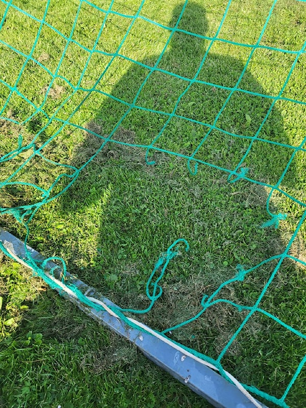I lördags var vi ett gäng som satte på nya nät på 5 mot 5 målen så de är hela till Claes Ekmans Minnescup nu på lördag. I kväll när jag var ute på Storåvallen ser jag att det står en gräsklipparen upp på ett av mål. Man blir rätt så ledsen och tji när jag ser att den har klippt hål i nätet. Som jag har sagt innan så måste vi lägga ner målen utan för planerna när de inte används