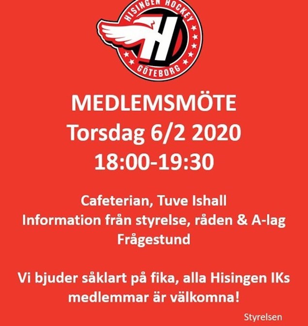 Hej medlemmar i Hisingen Hockey! Den 6/2 har vi medlemsmöte i Cafét i Tuve ishall. Då kommer vi att informera från styrelsen, de olika råden och A-laget. Vi kommer också att ha en frågestund, så kom ner till hallen och ta med de ämnen just du tycker är viktiga. Välkommen! Styrelsen genom alexandra