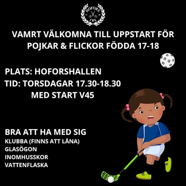 Torsdag vecka 45 är första träningen för pojkar & flickor födda 17-18 i Hoforshallen 17.30-18.30. Ingen anmälan krävs så det är bara att dyka upp!