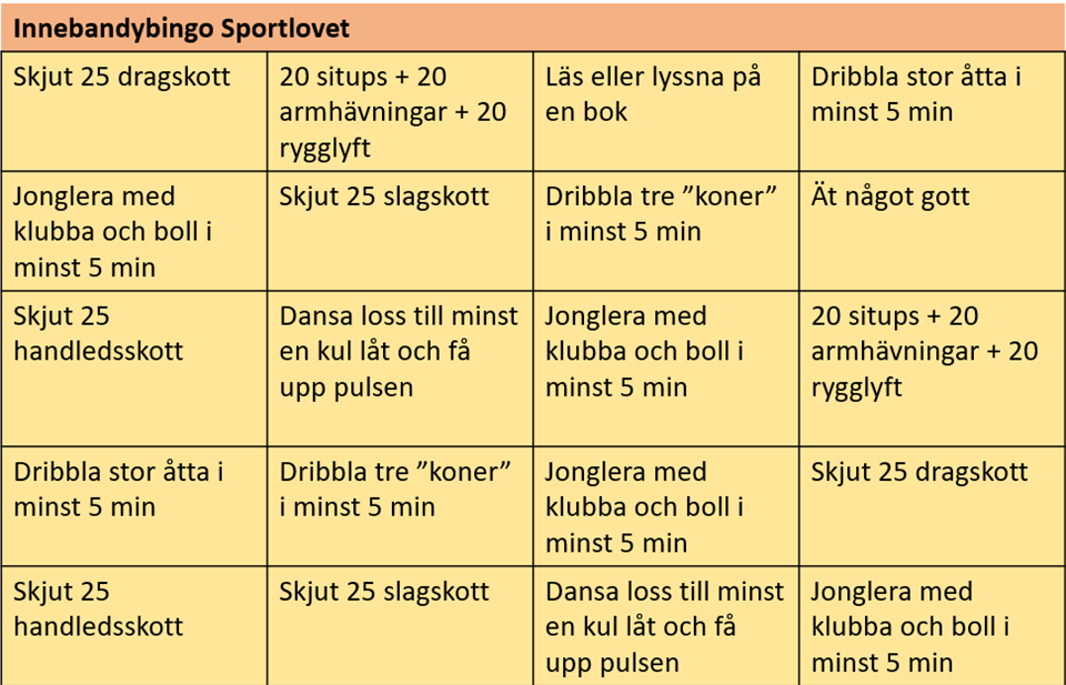Hej Innebandyfans, ingen träning under sportlovsveckan ! För att hålla ett litet försiktigt fokus på innebandy under sportlovet så utmanar vi alla spelare på ett innebandybingo. Det finns ett litet hemligt pris i potten ! Veckan efter sportlovet gäller följande: Träning Onsdag 8 mars kl 19-20:30 Sjöviksskolan Torsdag 9 mars kl 17-18 Liljeholmshallen motionsrum 3. Match Lördag 11 mars (B) Värmdö (4vs4) Ha ett bra sportlov ! Ledargänget