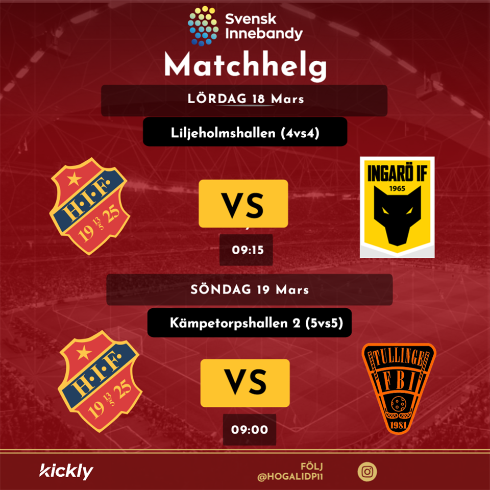 Hej Innebandyfans, denna vecka har vi följande aktiviteter: Träning: Måndag 13 mars kl 19-20 Liljholmshallen Onsdag 15 mars kl 19-20:3o Sjöviksskolan Match: Lördag 18 mars kl 09:15 vs Ingarö (H) (4vs4) Liljeholmshallen 1 Söndag 19 mar kl 09:00 vs Tullinge (H) (5vs5) Kämpetorpshallen 2 Observera att söndagens match spelas i Kämpetorpshallen. Väl mött ! Ledargänget