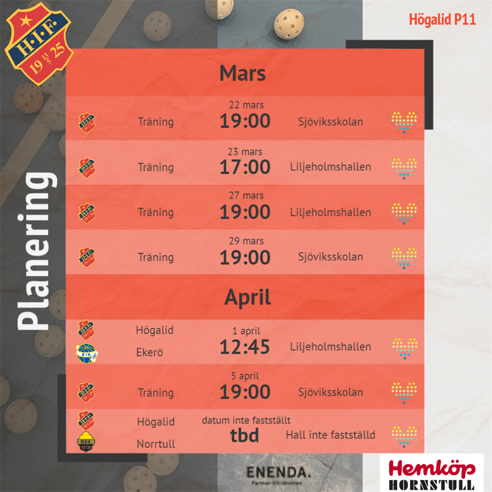 Hej alla innebandyfans Intensiv helg med två frukostmatcher avverkade. Tack alla sargbyggare och sargrivare ! Vi går nu in i en något lugnare period utan seriespel. Kommande helg är matchledig och vi spelar den sista inplanerade seriematchen den 1:a april. Vi har kontakt med Norrtull för kunna spela den match som ställdes in, och det är bara en fråga om att hitta en halltid och komma överens. Planering veckorna som kommer. VI skickar ut kallelse, och meddelar om det dyker upp ngn mer aktivitet. Träning: Onsdag 22 mars kl 19-20:30 Sjöviksskolan Torsdag 23 mars kl 17-18 Liljholmshallen Måndag 27 mars kl 19-20 Liljholmshallen Onsdag 29 mars kl 19-20:30 Sjöviksskolan Onsdag 5 april kl 19-20:30 Sjöviksskolan Match Lördag 1 april kl 12:45 vs Ekerö (H) (ljusröd) Liljeholmshallen Under april vs Norrtull (ljusröd) Väl mött ! Ledargänget