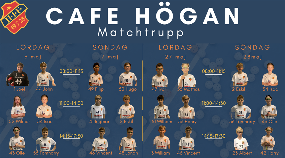Hej Innebandyfans, Vi har två cafe Högan-helger under maj - 6-7 maj & 27 & 28 maj. Antalet pass är fler än antalet spelare i truppen, vilket ger att några har två pass under våren. Vi kommer att ha minst en Cafe-helg under hösten, och då kommer det att jämna ut sig. Passen är redan fördelade och om de tiderna inte fungerar får man försöka byta pass sinsemellan. Gör det via t ex vår gemensamma whatsapp-grupp. Laget får ett bidrag till lagkassan för varje Café-helg, vilket betyder att vi kan minimera intaget till lagkassan för lagaktiviteter. Matchtrupp i Cafét: Pass 1: 08:00-11:15, Pass 2: 11:00-14:30, Pass 3: 14:15-17:30 Lördag 6 maj P1: Ivar & John P2: Wilmer & Isac P3: Joel & Tomharry 7 Söndag maj P1: Filip & Hugo P2: Ingmar & Eskil P3: Vincent & Jonah Lördag 27 maj P1: William & Mattias P2: Wilhem & Henry P3: VAKANT & Vincent Söndag 28 maj P1: Eskil & Isac P2: Tomharry & Olle P3: Albert & Harry