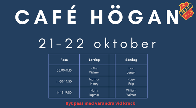 Hej Innebandyfans, helgen 21-22 oktober ansvarar P11 för Café Högan. Lördag 21 okt 08:00-11:15 Olle & Wilhem 11:00-14:30 Mattias & Henry 14:!5-17:30 Harry & Ingmar Söndag 22 okt 08:00-11:15 Ivar & Jonah 11:00-14:30 Hugo & Filip 14:!5-17:30 William & Wilmer Vänligen bekräfta kallelsen så slipper du telesamtalet. Byt med varandra i första hand. Väl Mött ! Ledargänget