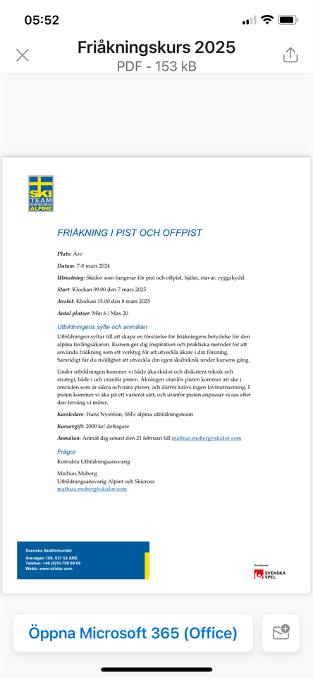 Hej, Lägret består av 2 st friåknings dagar och kommer innehålla Fri och Styrd-friåkning. Ta med skidor och stavar för både GS och SL om ni har det(ingen utrustning för bana behövs). Vi kommer bo i en storstuga + en lägenhet. För icke aktiva(åkare+tränare) kommer betalning (boende 200kr+grupp-rabatterade liftkort) ske i efterhand(klubben faktureras). Handuk och sängkläder medtages. Restaurang för lunch och middag om så önskas finns på gångavstånd. Knatte/Ungdom 27 dec 2024 5kommentarer