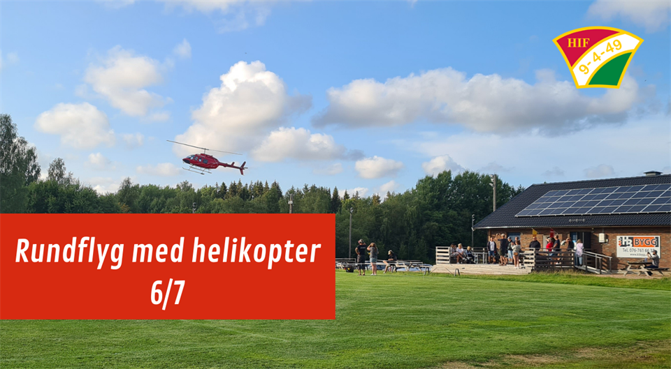 För dig om missade chansen förra året, eller för dig som vill ta en helikoptertur över Hogstorp en gång till så kan vi meddela att helikoptern besöker oss igen! 🚁 Onsdag den 6:e juli kl 17:30 kommer Heliair till Bräckevallen och kör rundflygningar. Flygturen är 4-5 minuter lång och ingen platsbokning krävs. Priset är 350 kr per person, vuxen som barn. (Swish eller kontant på plats) Ta gärna med egna hörselskydd. Helikoptern är på plats max 1 timme, eller så länge någon står i kö, så kom i tid om du vill åka. Kiosken kommer att vara öppen för den som vill ta en fika i samband med turen. Välkomna hälsar Heliair Sweden & Hogstorps IF Tips! Hyr hela helikoptern och ta med upp till 5 pers i 15 minuter för 4.500:- eller i 30 min för 8.000:- . Skicka önskemål till helikopter.rundflyg@outlook.com Hogstorps IF 27 jun 2022 0kommentarer