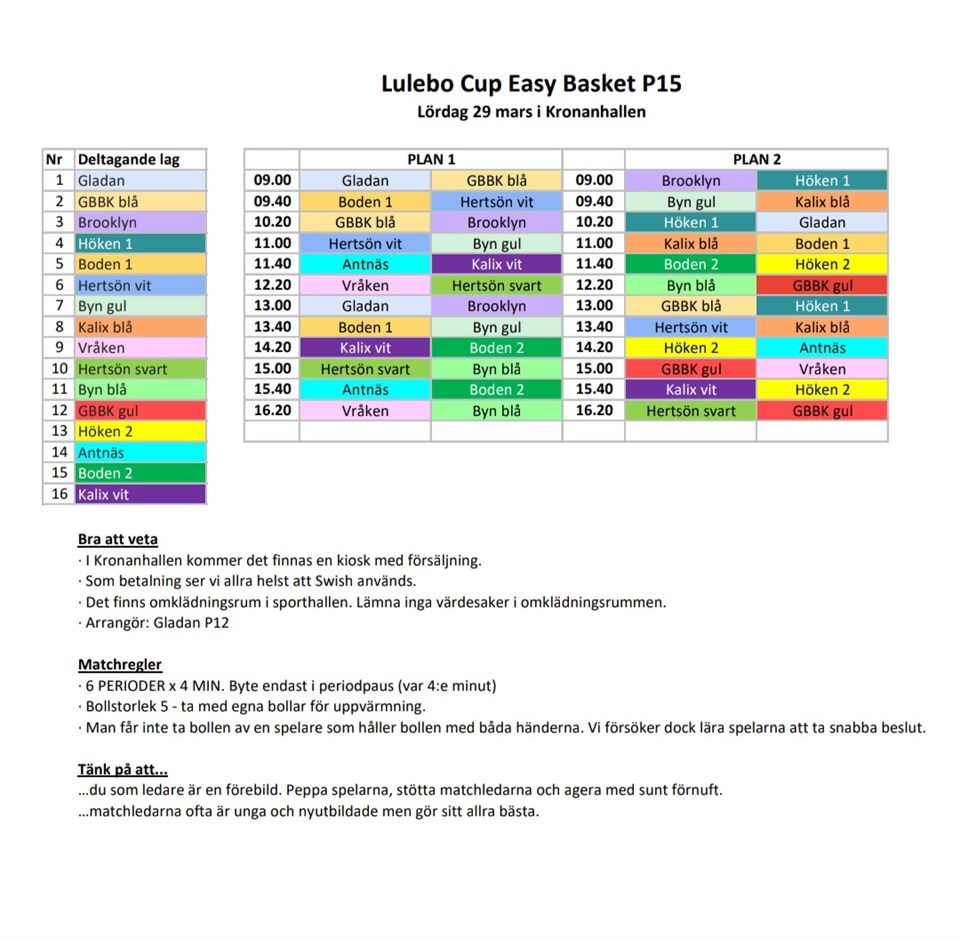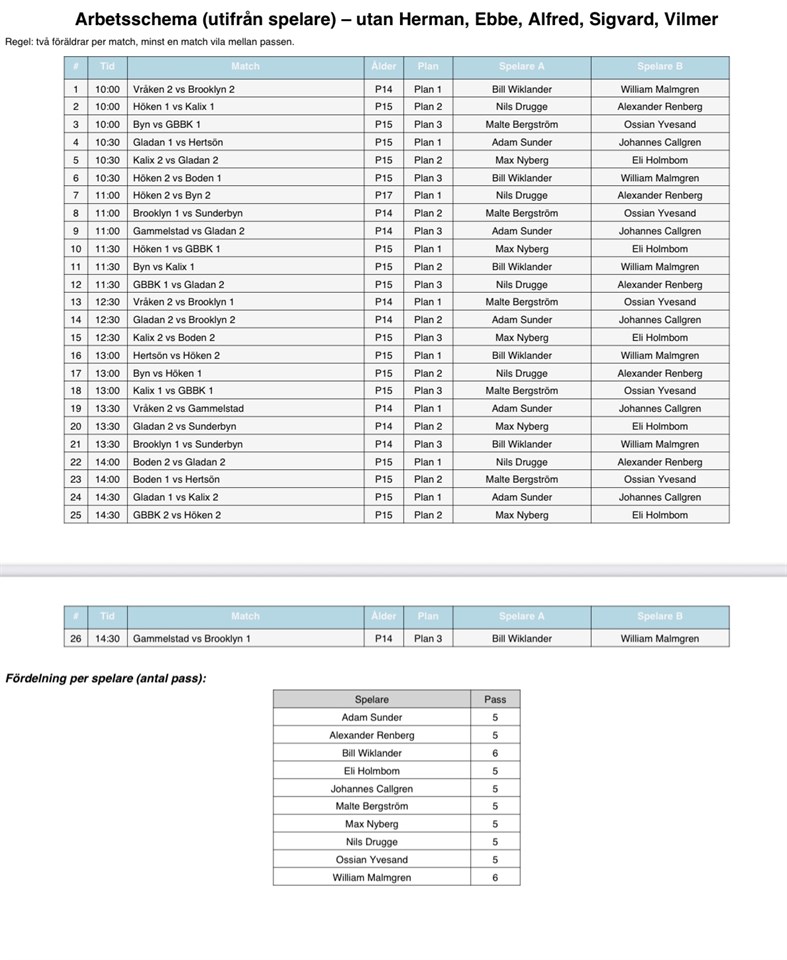 Tidtagning för samtliga matcher under söndagen (enligt schemat). Barnets namn = förälder till barn ansvarig. 2 föräldrar/match.