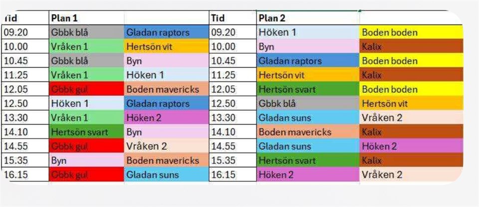 Spelschema inför lördagens sammandrag enligt bild, samling 30 minuter före första matchen.