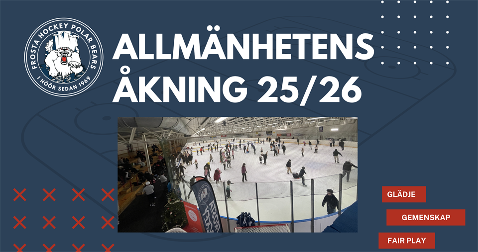 Allmänhetens åkning är öppet på lördagar under säsongen från början av oktober till i slutet av mars kl 13:30 -16:00 eller kl.14.00-16.00 (Håll koll på tiderna, vissa lördagar kommer ha avvikande öppentid pga matcher. )