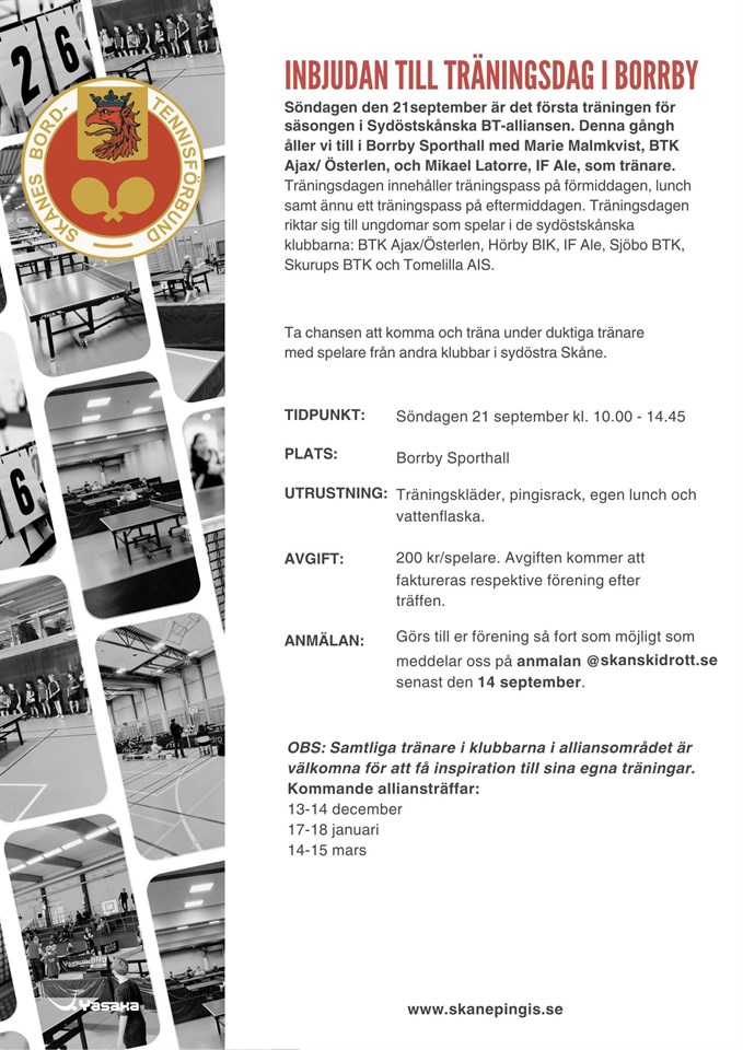 Skånes Bordtennisförbund bjuder in till en träningsdag där klubbarna i Sydöstra Skåne är inbjudna. Ta denna möjlighet att träna med andra och under ledning av andra duktiga tränare. All info hittar ni i bilden. Anmälan görs till oss.