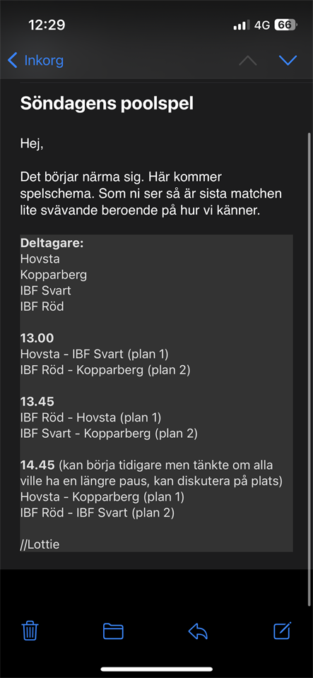 Nu har spelschemat kommit för söndagens poolspel(4/2). Första matchen börjar kl. 13.00 och det är samling i Hovsta för dem som vill vid 12.00. Meddela om ni åker direkt. Se till att tjejerna är ombytta, har med sig rätt utrustning samt har varit på toa innan samlingen. //Ledarna IB F 13-15 31 jan 2024 3kommentarer