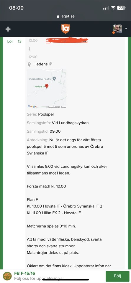 Hej på er! Så himla roligt att vi är ett stort gäng på träningarna igen!! Hovsta IF har avtal med kommunen om att vi själva tar han dom vår anläggning (ej gräsklippning) och varje lag har några veckor per säsong som man ansvarar för anläggningen. Vi behöver någon som är ansvarig för att hålla koll på vilka veckor som är våra och ta initiativ till att samla föräldrar (och ev barn) för att göra en insats 1-2 gånger under de aktuella veckorna. Vilka arbetsuppgifter som ska göras ser ni under dokument på fotbollssektionens sida. Dokumentet heter "anläggningsschema". Det handlar alltså om att hålla koll och ta initiativ- du behöver inte göra allt själv utan alla föräldrar behöver hjälpa till de aktuella veckorna. Så, men kan tänka sig att ta detta ansvar? Med vänlig hälsning, Ledarna FB F-13/14 3 maj 2023 4kommentarer