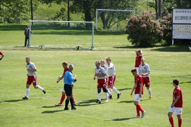 Under torsdags eftermiddagen lyckades vi besegra Borrby på bortaplan. Vi saknade en del spelare sen förra matchen. Emil och Viktor avstängda, Viktor målvakt sjuk och Thomas fortfarande skadad. På planen märktes dock inte detta märkbart utan de som spelade idag skötte sig utmärkt. Vi som var på plats fick se Borrby göra första målet på en lång frispark som snöpligt nickskarvades förbi Figge. Men 10 minuter efter detta gör vi 1-1 på hörna från Ola som Ferki stenhårt stångade in vid bortre stolpen. Detta resultat står sig halvleken ut trots en del chanser på båda hållen. Efter en kvart i andra smiter Olas pass igenom Borrbys försvar och Petter blir ren med målvakten. Utan att tveka rullar han retfullt enkelt in bollen vid ena stolpen. Glädjen blir inte långvarig, bara ett par minuter senare blir det 2-2 efter en tilltrasslad situation vid en hörna. Kan tom varit självmål. Sen händer ett par saker som nog alla pratade om i bilen hem och som blev matchavgörande. Med 20 minuter kvar nickar Ola in 3-2 på en gammal inkastvariant, dock ej inövad på länge. Grymt, Anders och Jolle. Med 10 minuter kvar gör Figge en fanstastisk räddning på en nick från nära håll då han får dra nytta av hela sin kroppslängd för att stöta ut bollen till hörna. Tack för den Figge. En stund senare får Figge tyvärr kliva av efter att knäet svullnat upp. Ola ställer sig mellan stolparna och ser hur säker ut som helst. Borrby lyckas inte skapa något under de sista minuterna och alla 3 poängen hamnar i Huaröd. Nu håller vi långhelg så syns vi nästa vecka. Härligt detta pojkar.