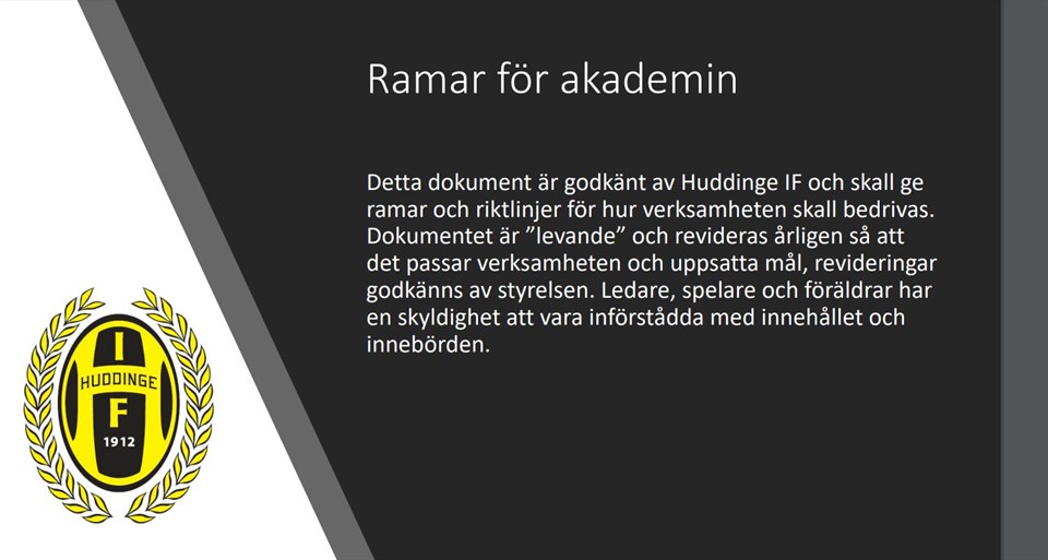 Inför nästa års säsong har Huddinge IF:s styrelse godkänt en ny rambeskrivning för föreningens akademiverksamhet. Mycket är sig likt, en del revideringar har gjorts. Dokumentet är tänkt att fungera som stöd och riktlinjer för ledare, spelare och föräldrar så det är viktigt att alla läser och förstår inför den kommande säsongen.