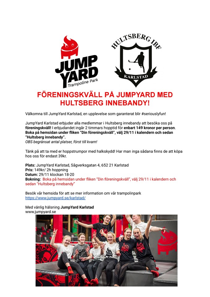 FÖRENINGSKVÄLL PÅ JUMPYARD MED HULTSBERG INNEBANDY! Välkomna till JumpYard Karlstad, en upplevelse som garanterat blir #seriouslyfun! JumpYard Karlstad erbjuder alla medlemmar i Hultsberg innebandy att besöka oss på föreningskväll! I erbjudandet ingår 2 timmars hopptid för enbart 149 kronor per person. Boka på hemsidan under fliken “Din föreningskväll”, välj 29/11 i kalendern och sedan “Hultsberg innebandy”. OBS begränsat antal platser, först till kvarn! Tänk på att ta med er hoppstrumpor med halkskydd! Har man inga sådana finns de att köpa hos oss för endast 39kr. Plats: JumpYard Karlstad, Sågverksgatan 4, 652 21 Karlstad Pris: 149kr/ 2h hoppning Datum: 29/11 klockan 18-20 Bokning: Boka på hemsidan under fliken “Din föreningskväll”, välj 29/11 i kalendern och sedan "Hultsberg innebandy” Besök vår hemsida för att se mer information om vår trampolinpark https://www.jumpyard.se/karlstad/ Med vänlig hälsning JumpYard Karlstad