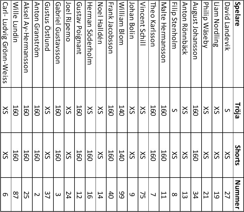 God förmiddag! Nu har vi alla storlekar och tröjnummer avseende våra nya matchställ. Inom kort (början på nästa vecka) kommer vi att beställa dem. I den bifogade bilden återfinns storleks- och nummerförteckning. Den som vill kan ju dubbelkolla förteckningen en sista gång innan vi beställer. MVH BJ P-09 20 aug 2020 14kommentarer