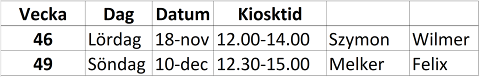 Hej! Vi har fått tilldelat oss tider för hösten 2023, som vi ska bemanna kiosken i samband med match. Kan ni inte den tiden ni har tilldelats så får ni själv försöka byta. Meddela Mattias ev. byten på tel nr 070-9804628 Mattias försöker även svara på ev frågor. /Mvh Ledarna P-08/09 8 nov 2023 0kommentarer