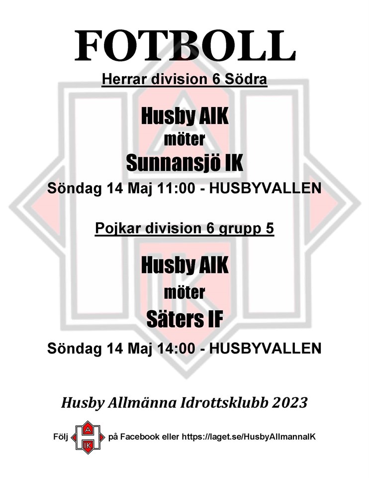 Hej! Snart är Husbyvallen redo att spelas på, vi planerar för att börja ute V.17 med alla grupper. Som en del kanske redan sett har vi flyttat om lite här på hemsidan www.laget.se/HusbyAllmannaIK. HAIK 1 är våra två yngsta grupper som delar hemsida till att börja med så får vi se om det blir rörigt eller inte. Det är barn födda 2020-2018 och 2018-2016. Barnen födda 2018 hamnar i 2 grupper, detta gör att man kan hoppa med där barnen tycker det är roligast och passar bäst. De kommer att ”träna” samma tid, Onsdagar kl 17:30 med start den 26/4. HAIK 2 är barn födda 2015-2014. Här är vår tanke att vi ska försöka dela upp det, flickor och pojkar. Främst för att få fler flickor i verksamheten då vi tappat lite i dessa åldrar. Självklart kommer en del grejer göras tillsammans pojkar och flickor, och blir det inte tillräckligt många flickor så spelar de självklart med pojkarna. Träningar kommer vara Tisdagar och Torsdagar kl 18:00 med start den 25/4. Fram till dess kör vi på Vasaliden Lördag 15/4 och 22/4 kl 11:00. HAIK 3 är barn födda 2013 och äldre. Här kommer vi förhoppningsvis kunna dela upp det lite efter ålder när vi väl är igång. Vi har anmält 2 lag till seriespel och hoppas verkligen vi kan få ihop det. De kommer träna Tisdagar och Torsdagar med start 25/4 kl.18.00. Denna grupp har också tid på Vasaliden lördagar 15/4 och 22/4 kl 11:00. Torsdagsträningen för HAIK 2 och 3 är en träning där det kommer spelas mycket match och de har den som sin andra träning. Men vi hoppas att alla i föreningen barn, föräldrar, mor- och farföräldrar (Fotboll för alla) vill vara med. Vi provade förra säsongen och det var väldigt uppskattat för de som var med, både vuxna och barn. Vårat seniorlag spelar denna säsong div 6 och där är man såklart också välkommen att vara med, de tränar just nu på Vasaliden Måndagar och Onsdagar kl 20:00. Hemma på Husbyvallen kommer de att träna på Tisdagar och Torsdagar 20.00. Vid frågor om A-laget kontakta Olle Mases 070 201 95 43. Vi ser fram emot en ny sommarsäsong och hoppas såklart ännu fler vill komma och hänga med oss! Vid frågor kommentera nyheten eller ring Andrée Eriksson 072 362 68 65 Med vänlig hälsning Husby AIK