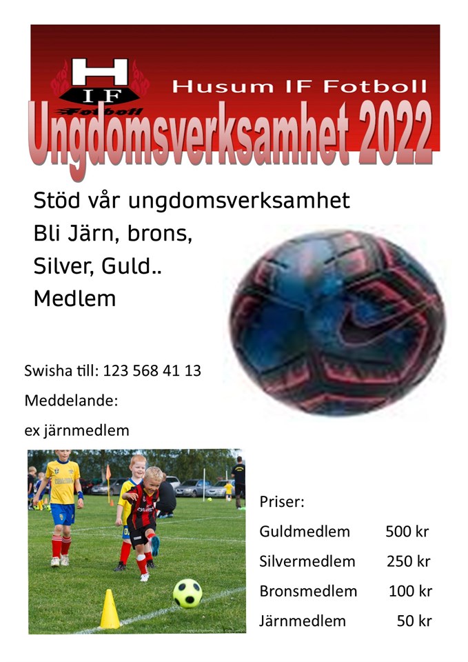 Hej Vill du stödja vår ungdomverksamhet, du kan bidra med att "köpa" en boll. Vi har några små tavlor hängande på väggen vid Cafeterian, om du vill så skriver vi in ditt namn på respektive tavla som motsvarar värdet på gåvan. ex skänker du 50 kr = järnboll så får du ditt namn på den tavlan. Vi hoppas på att du vill och kan stödja vår verksamhet, inget bidrag är för litet, varje bidrag gör att vi kan hålla ner olika avgifter som vi annars behöver ta ut av aktiva och deras föräldrar för att hålla verksamheten igång. Husum Fotbolls ambition är att ALLA ska kunna spela fotboll utan att någon ska behöva vara utanför på grund av ekonomi. Det bästa med att vara med i fotbollen är att se och höra alla leka, träna, spela oavsett om matchen slutar i dur eller moll men med glädjen i ögonen efter att få dela detta med vänner. Det gör sommaren för mig och jag ser fram emot den med öppna armar SOL, FOTBOLL de e sommar. Örjan Forsberg / ordförande Husum fotboll