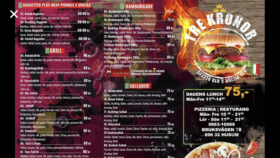 Hej fotbollsvänner! from 1/6 har vi ny ägare på Tre kronor Fuad Hikmat. Vi har då glädjen att meddela att Han har ingått ett sponsor avtal med oss, Husum fotboll. Han sponsrar 2kr/från för varje såld hamburgare till klubben. Så gör ett besök hos honom och köp en av hans läckra hamburgare!! Välkommen Fuad och lycka till med restaurangen, och må många hamburgare nu bli sålda !!
