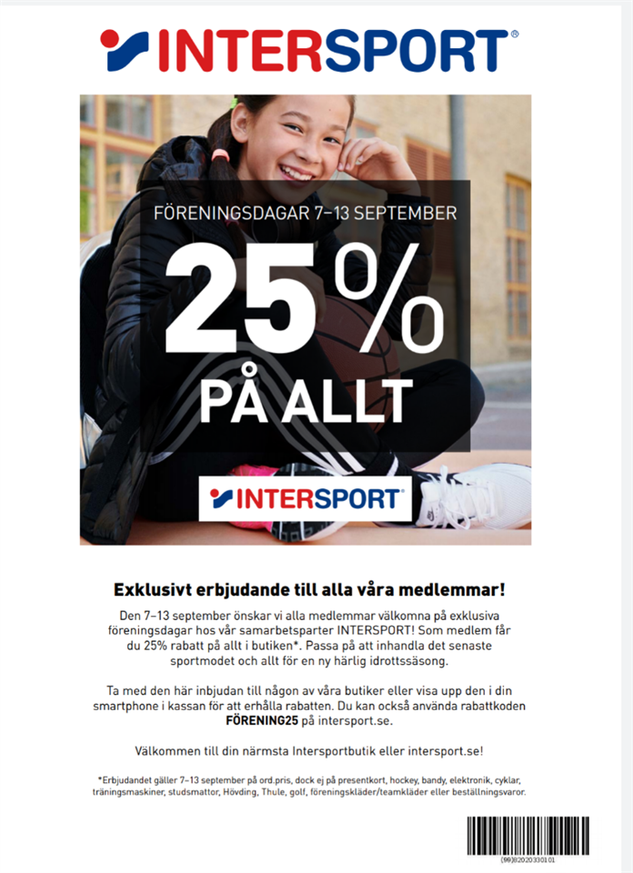Den 7–13 september är det föreningsdagar hos vår samarbetspartner Intersport och ni får en exklusiv rabatt om 25% på de flesta varor. Passa på att köpa allt från sneakers och jackor till träningskläder och prylarna för kommande idrottssäsong. Se bifogad fil för mer information. F11/12 7 sep 2020 0kommentarer