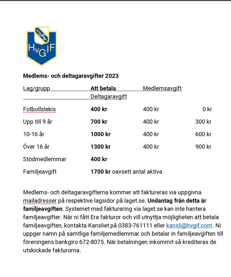 Hej Under dagen kommer medlems- och deltagaravgifter för 2023 skickas ut på mejl med sista betalningsdag 31 maj. Bifogat ser ni årets avgifter samt hur ni gör för att betala familjeavgiften. Har ni frågor så kontakta kansliet på kansli@hvgif.com. Avgifterna för Fotbollslekis skickas ut vid ett senare tillfälle eftersom våren är en period då de allra yngsta testar på att träna fotboll. Välkomna till en kul fotbollssäsong med Hvetlanda GIF. F11/12 2 maj 2023 0kommentarer