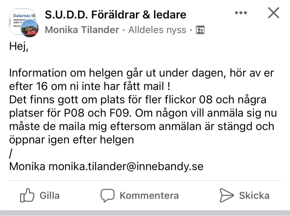 Har bifogat en bild från SUDD Facebook, där ser ni vad gruppen heter, lägg gärna till er. Mer info per Mail kommer ut under dagen från dalarnas för de som har anmält sig. Vill man anmäla sig nu måste man maila till Monica, se Mail i bild. Hälsning ledarna DJ/JAS 2 okt 2023 0kommentarer
