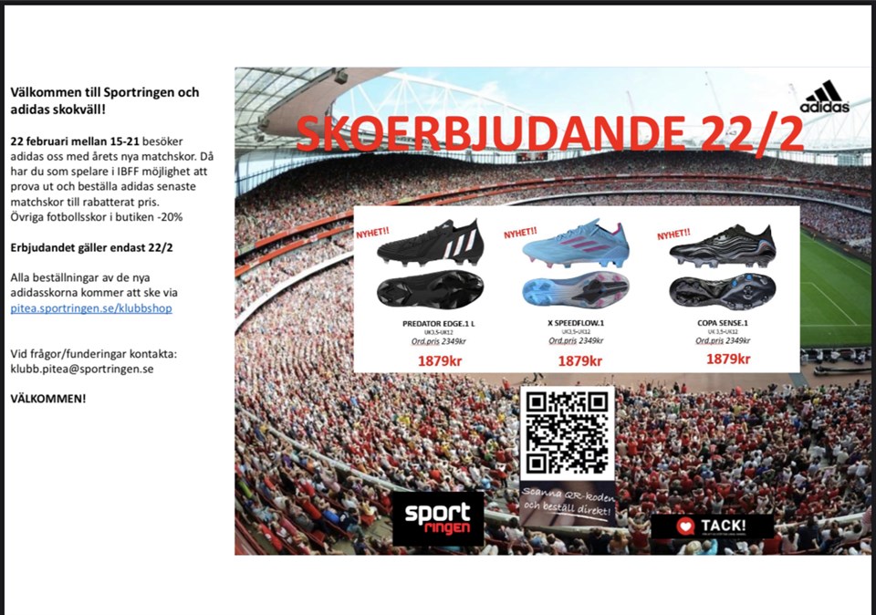 Välkommen till Sportringen och adidas skokväll! 22 februari mellan 15-21 besöker adidas oss med årets nya matchskor. Då har du som spelare i IBFF möjlighet att prova ut och beställa adidas senaste matchskor till rabatterat pris. Övriga fotbollsskor i butiken -20% Erbjudandet gäller endast 22/2 Alla beställningar av de nya adidasskorna kommer att ske via pitea.sportringen.se/klubbshop Vid frågor/funderingar kontakta: klubb.pitea@sportringen.se VÄLKOMMEN! F08/09 21 feb 2022 0kommentarer