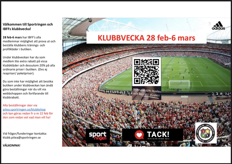 Välkommen till Sportringen och IBFFs klubbvecka! 28 feb-6 mars har IBFF’s alla medlemmar möjlighet att prova ut och beställa klubbens tränings- och profilkläder i butiken. Under klubbveckan har du som medlem lite extra rabatt på vissa klubbkläder och dessutom 20% på alla ordinarie priser i butiken. (Dvs ej reapriser/ paketpriser). Du som inte har möjlighet att besöka butiken under klubbveckan kan ändå göra beställningar när du vill via webbshoppen och fortfarande till klubbrabatt. Alla beställningar sker via pitea.sportringen.se/klubbshop och kan göras redan fr o m 22 feb för den som redan vet vad man vill ha! Vid frågor/funderingar kontakta: klubb.pitea@sportringen.se VÄLKOMNA! F08/09 21 feb 2022 0kommentarer