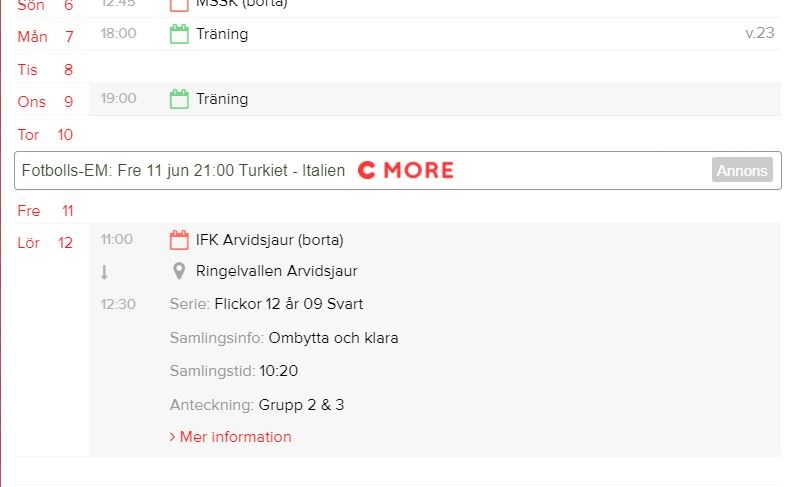 Nu har jag lagt upp alla matcher manuellt då jag efter felanmälan till laget.se fått bekräftat att det är ett fel i kopplingen mellan förbundet och alla laget-sidor. De visste inte när felet skulle vaa åtgärdat så det var bäst att göra såhär. Fördelen blev då att jag kan lägga in mer info under resp. match i kalendern så nu står det där vilka grupper som spelar och vilken tid det är samling (se bild ovan). Vi fortsätter ändå att lägga ut en nyhet inför varje match. Hoppas det underlättar för er. /Claes F08/09 9 jun 2021 1kommentar