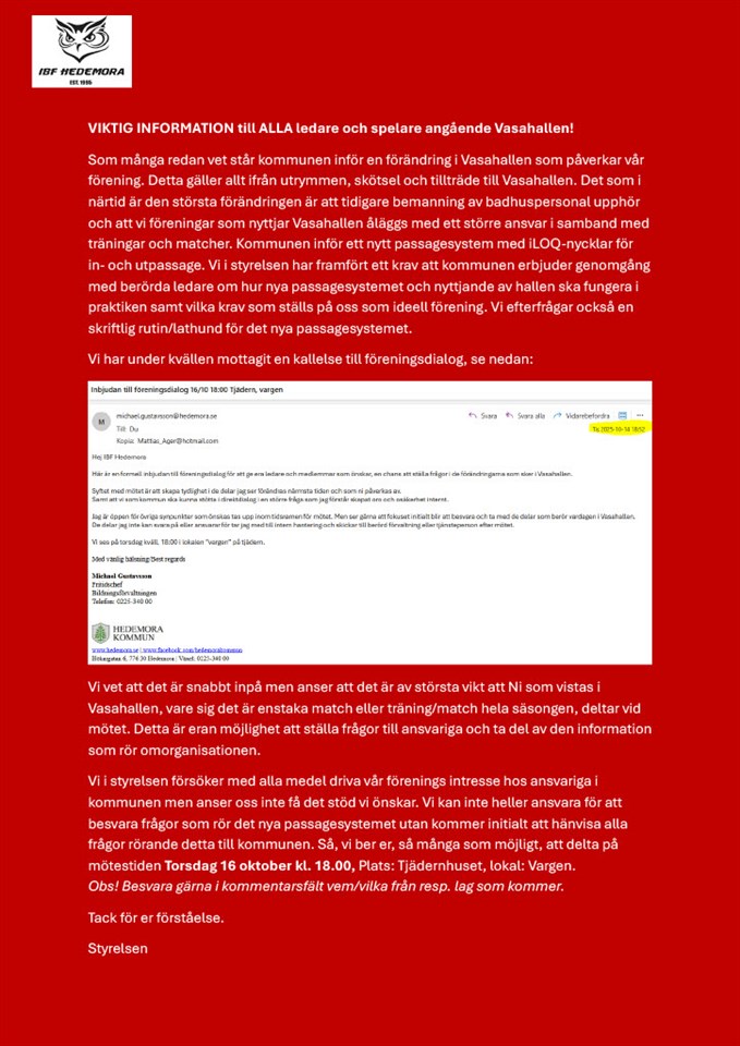 Vi vet att det är snabbt inpå men anser att det är av största vikt att Ni som vistas i Vasahallen, vare sig det är enstaka match eller träning/match hela säsongen, deltar vid mötet. Detta är eran möjlighet att ställa frågor till ansvariga och ta del av den information som rör omorganisationen.
