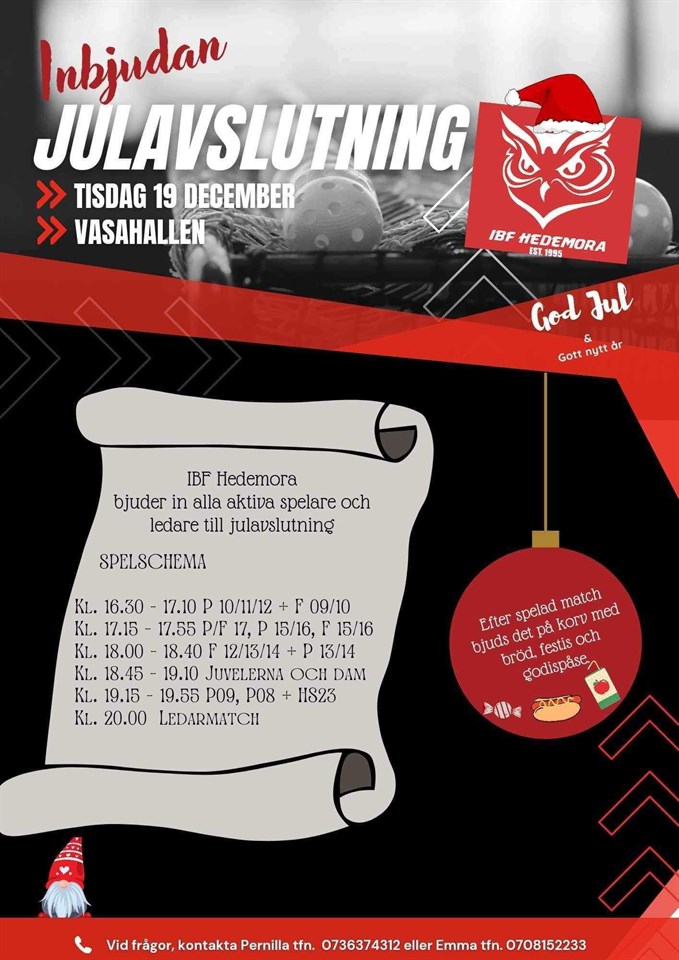 Tisdag den 19/12 är det julavslutning för föreningen i vasahallen! Våra grabbar har tiden 17.15 - 17.55. Det blir sista gången vi ses detta år. Vi kör igång igen med träningarna 12/1 -24 // Ledarna