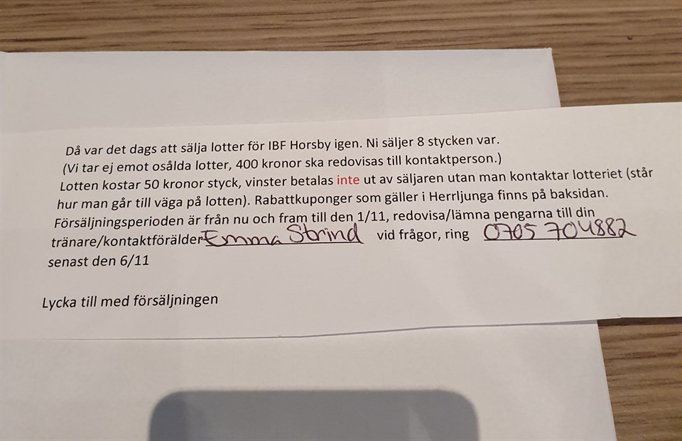Nu är det dags för klubben att sälja lotter igen. Likadana som förra året. Tänker att ni föräldrar behöver hämta ut dem för att vi ska slippa ha lotter "på vift". I början av träningen på torsdag är jag Emma där och lämnar ut dem. Lite jobb av samtliga så har vi snart tjänat in lite pengar till våra grabbar & tjejer , det blir perfekt!! Se bilden ovan för ytterligare info. Swisha numret som står på lappen, direkt eller när ni sålt klart, dock senast 6/11. Märk swish med P8 + NAMN /Emma C Strind P11/P12/P13 9 okt 2020 0kommentarer