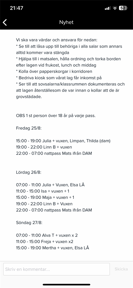 Hej Det gick inte att skicka schemat i tråden på inlägget... Se bifogat kort. Vi har fått frågan att hjälpa till med Logi /skolvärdar på JAS elit cup på Rudbecksskolan 25-27 augusti. Vi ska vara värdar och ansvara för nedan: * Se till att låsa upp till behöriga i alla salar som annars alltid kommer vara stängda * Hjälpa till i matsalen, hålla ordning och torka borden efter lagen vid frukost, lunch och middag *Grovstäda o kolla papperskorgar o korridorer * Ansvar att bedriva enkel kiosk som vårat lag bedriver på skolan * Ser till att sovsalarna/klassrummen dokumenteras och att lagen återställer rummen som de var innan o kollar att de är grovstädade. Jour och ansvarig under helgen för Logi är Mats Eriksson ifrån Dam laget, 076 780 43 95. Eller jag samt Lasse B. Mvh Andreas B IBF Örebro DJ 21 aug 2023 1kommentar