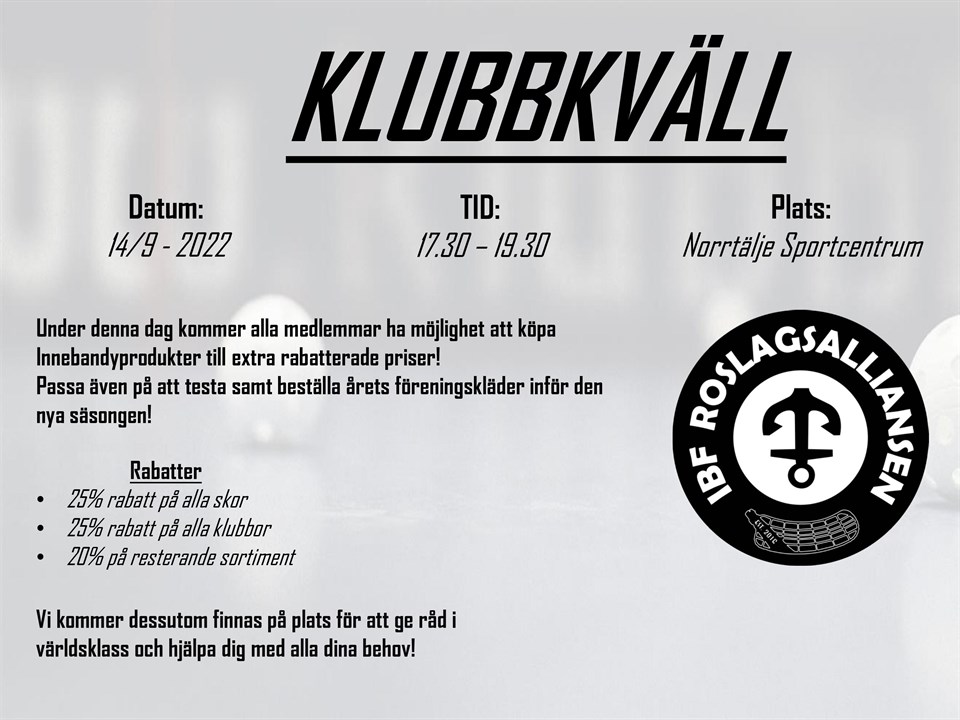 Hej Allesammans, Då var det dags för föreningsaktivtet då Klubbhuset kommer på besök till oss där ni kommer att kunna köpa innebandyprylar till rabatterade priser. Datum: 2022-09-14 Tid: 17:30-19:30 Plats: Sportcentrum Norrtälje Varmt välkomna! Styrelsen IBF Roslagsalliansen. 14 Norrtälje 17 aug 2022 0kommentarer