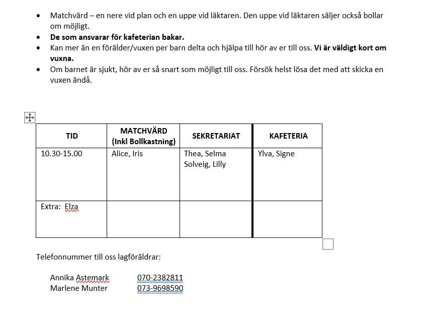 Jag saknar fortfarande en person som sitter i sekretariatet på lördag. Får jag ingen frivillig före klockan 18.00 imorgon kväll så kommer jag att lotta vem som får ta det. Vi måste bemanna 3 matcher. F11-13 7 dec 2023 3kommentarer