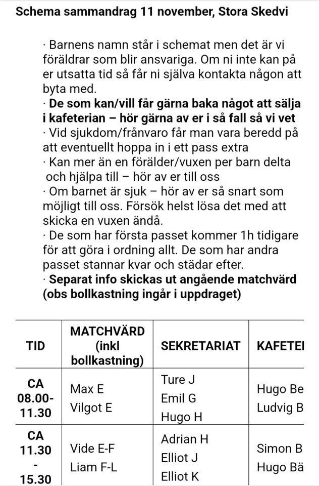 Hej! Vi har fått sena passet 11/11 men önskar byta till tidiga, om någon kan byta? Jag och Adrian kommer behöva åka vid 14.30. /Lina