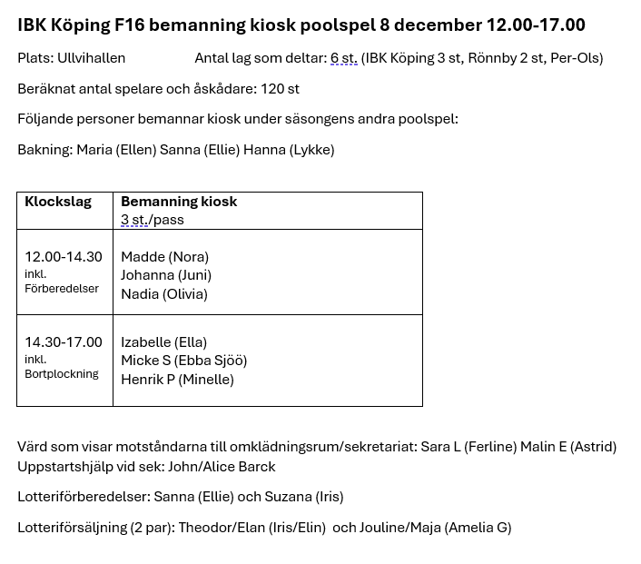 Tjejernas poolspel på söndag närmar sig med stora steg! Här kommer schema för kiosk, sekretariat och lotteri: Som vanligt hjälps vi alla åt med att bygga/riva sarg och hålla ordning i hallen inför/under och efter själva poolspelet. Vi vill skapa lite julstämning under söndagens poolspel. Därför får musiken som spelas gärna ha juligt tema och likaså ni som bemannar kiosken får mer än gärna ta på er något juligt (ja, gärna övriga besökare med såklart!) 😊 🎅?🎄 Vi kommer även att ha en gran under vilken vi lägger alla lotteriklappar. Och om möjligt, bidra gärna med 2 vinster till lotteriet (pluspoäng om de är inslagna som julklappar) Lotterna kommer att kosta 20 kr/lott. Meddela om det inte blir riktigt som ni tänkt er (sjukdom, förhinder) så att vi hinner planera om. Ps. Visst sa vi tack? 😃 /Tacksamma ledare i F16 F-16 3 dec 2024 0kommentarer