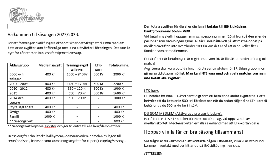Välkomna tillbaka allihop! Dags att betala medlemsavgiften! Se bild! Finns även att se på IBK:s förstasida under fliken "mer" "för medlemmar" Nu ser vi fram emot en rolig och givande säsong. /Ledarna