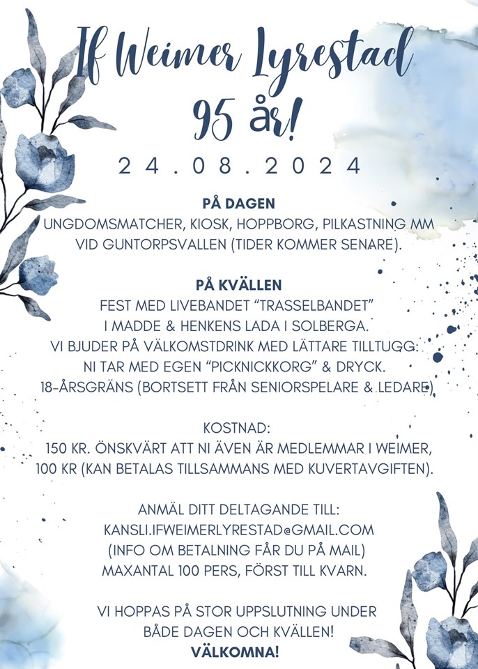 I år fyller föreningen 95 år och det ska firas den 24 augusti. Schema över dagen kommer framöver. Samla ihop ett gäng och anmäl er till kvällens festligheter, vi kan lova att ”Trasselbandet” bjuder på underhållning! Välkomna! PF 11-12 år 23 jun 2024 0kommentarer