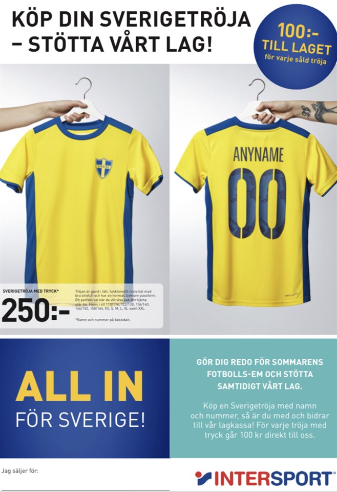 Snart stundar EM i fotboll och genom ett samarbete med Intersport finns möjlighet att köpa en Sverigetröja för 250 kr (med valfritt namn och siffra på ryggen). Av dessa 250 kr går 100 kr direkt in i föreningens ungdomsverksamhet. Tröjorna finns i storlek 110/116, 122/128, 134/140, 146/152, 158/164, XS, S, M, L, XL samt XXL. Vill du sprida de blå/gula färgerna samtidigt som du bidrar till ungdomsverksamheten skickar du en beställning till rydh.jens@gmail.com med följande uppgifter: namn, adress, telefonnr, storlek, antal och text på rygg (endast namn, endast nummer eller både och). Betalning sker via swish när du hämtar ut din tröja uppe vid Guntorpsvallen, vi meddelar när de kommit. Senast 14/5 behöver vi din beställning. Det finns inget tvång att barnen ska sälja tröjor, men har ni familjemedlemmar, släktingar, kompisar etc som ni tror skulle uppskatta detta, sprid gärna infon. På infobladet står det att pengarna går till laget, ett förtydligande gällande detta: Pengarna går till ungdomsverksamheten i stort, dvs inte kopplat till ett specifikt lag. Pengar som kan sätta lite guldkant på tillvaron.