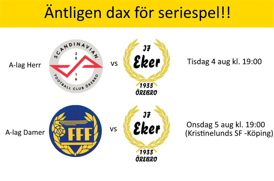 Då är det äntligen dax för seriespel igen! Herrarna spelar seriepremiär ikväll tisdag mot Scandinavian FC Örebro. Damerna spelar seriepremiär imorgon onsdag och åker till Köping för att möta Forsby FF. Lycka till våra A-lag önskar hela Eker familjen! IF Eker Örebro 4 aug 2020 0kommentarer