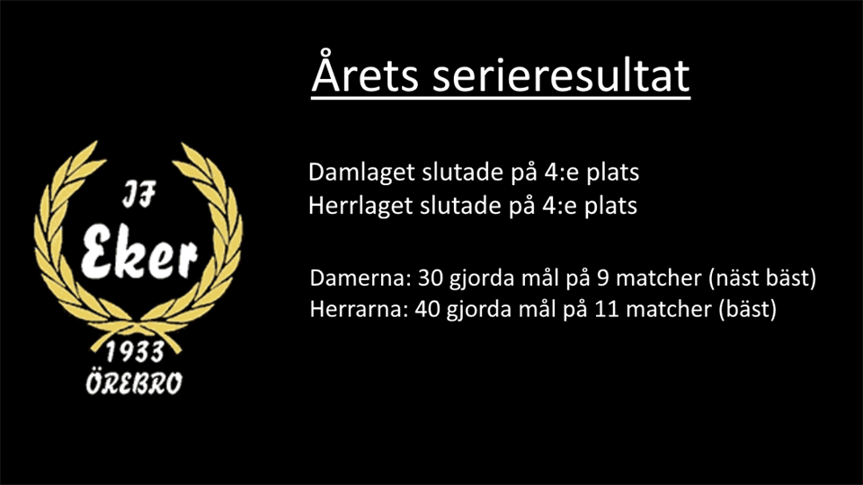 Det blir slutbetyg 4:a för årets insatser i div 4 serierna. Både dam- och herrlaget hamnade på en hedrande 4:e plats i sina serier med många gjorda mål. Damerna var näst bäst i serien att producera mål med 30 mål på 9 matcher och herrarna var bäst i sin serie med sina 40 mål på 11 matcher. Grymt bra! En intressanta synvinkel är att för herrarna så kan vi säga att de var “en dryg kvart” ifrån ett avancemang till Div 3: - Ledning med två mål ca en kvart från slutet borta mot Nora - Ledning med ett mål ca en kvart från slutet borta mot Sturehov - Ledning med två mål ca en kvart från slutet borta mot Hidingsta Hade Eker vunnit dessa toppmatcher så hade den hypotetiska tabellen med kvarten kvar blivit: IF Eker 28p Nora BK 27p Hidingsta IK 23p IK Sturehov 22p Nästa år så ökar vi istället takten den sista kvarten! Stort tack för alla fina prestationer under året! IF Eker Örebro 5 okt 2020 0kommentarer