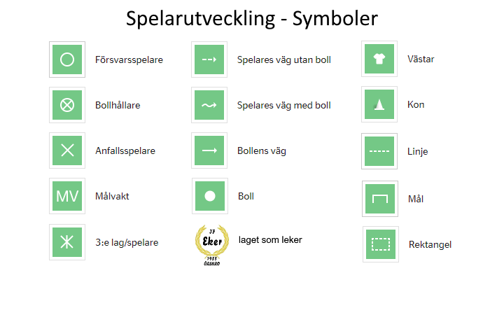 Nu tar vi träningen till en mer utbildande nivå där vi vill lära spelarna själva övningarna och deras syfte. Vi börjar med symbolerna som spelarna bör lära sig, så visa bilden ovan för killarna. Vissa har de redan sett tidigare, men det är aldrig fel med repetition då frågor och inlärning av övningar kommer framöver :-) Dessa symboler används inom svensk fotboll och även internationellt. Vi ses ikväll 18:30 och glöm inte att redovisa försäljningen av svensktillverkade fryspåsarna. Mvh, Tränarna