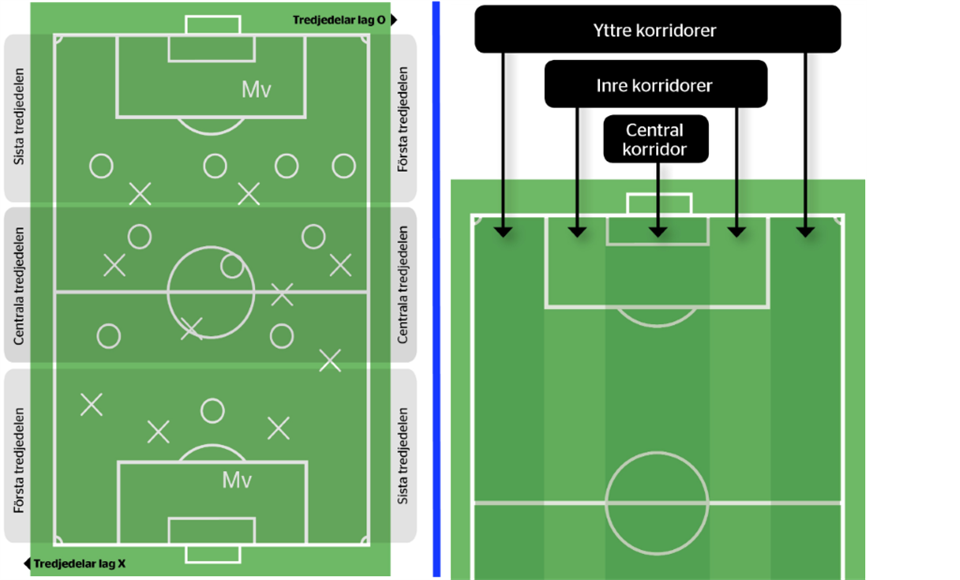 Seriespelet börjar till helgen, men endast för ena laget som åker till Laxå. Det andra laget fick sin match inställt. För att kompensera så kör vi en internmatch imorgon fredag kl 18 (vi är klara före 19:30). Det blir ca 16 grader varmt. Alla är välkomna. Obs. Innebär även att träningen nu på lördag (9/5) är inställd. Nästa vecka spelar vi hemmamatcher vi på fredag (lag vit) och söndag (lag svart). Observera att vi har nya träningstider: Måndagar 17:30 (konstgräs). Planen är ledig innan för de som vill leka med bollen. Onsdagar 18:00 (gräs) Lördagar 11:00 (gräs) För spelarutvecklingen så ser ni i bilden ovan en förklaring på planens tredjedelar och korridorer. Sedan är det så härligt att se att spelarnas egna inställning till prestera på träningarna blir bättre och bättre. Mvh, tränarna