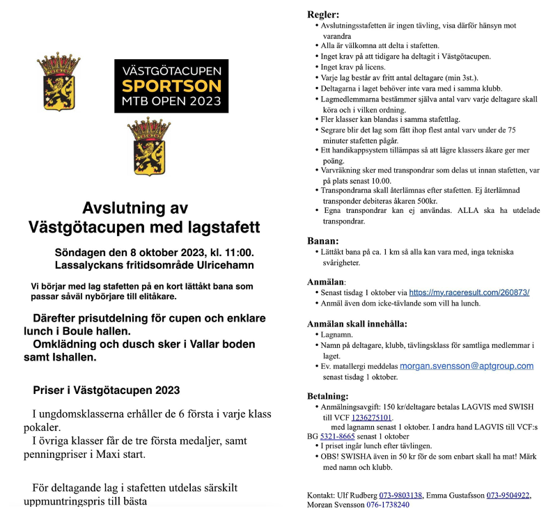 Söndagen 8/10 är det dags för årets roligaste event. Västgötacupens avslutning med tillhörande staffet på Lassalyckan i Ulricehamn.