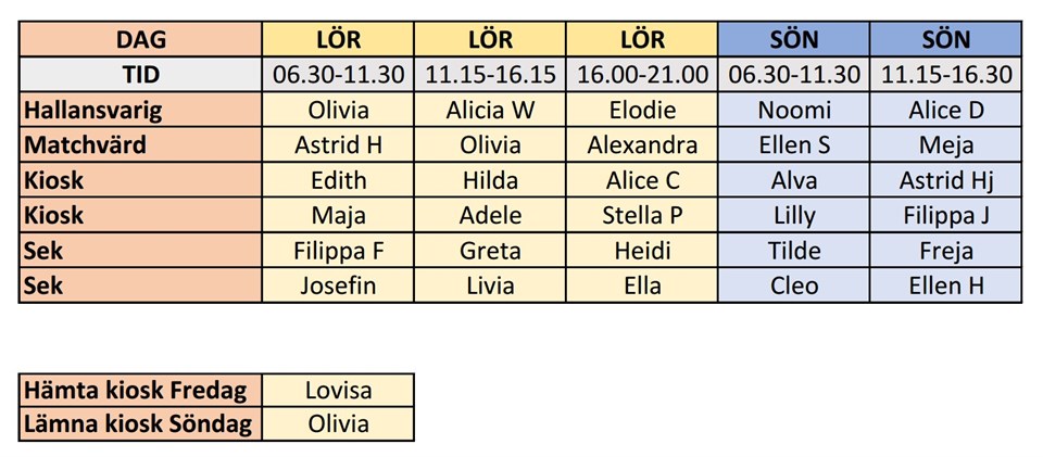 Hej igen, Nu har jag gjort ett nytt försök med bemaningsschemat inför Hellton cup... och hoppas ingen känner sig allt för missnöjd! :) Samma gäller som innan, behöver man byta så hör av er till varandra. På lördagen börjar första matchen 8.00 och sista 19.40. På söndagen börjar första matchen 8.00 och sista 15.00. Har man fått första tiden lör/sön så är planerad tid för att ställa i ordning. Vi får känna av men söndagen kanske inte behöver börja förens 7.00. Har man fått sista tiden på lör/sön så är det planerad tid för städning. Så INGEN lämnar förens allting är färdigt! Under flicken dokument finns instruktioner och viktigt info inför Hellton cup. Vi kommer få hålla matcher där F13 spelar, så ta jättegärna med er tjejerna! tror det kan vara roligt och givande för dom :) Det här blir kul hörre ni! :D F8 (Födda 2017) 13 nov 2025 3kommentarer